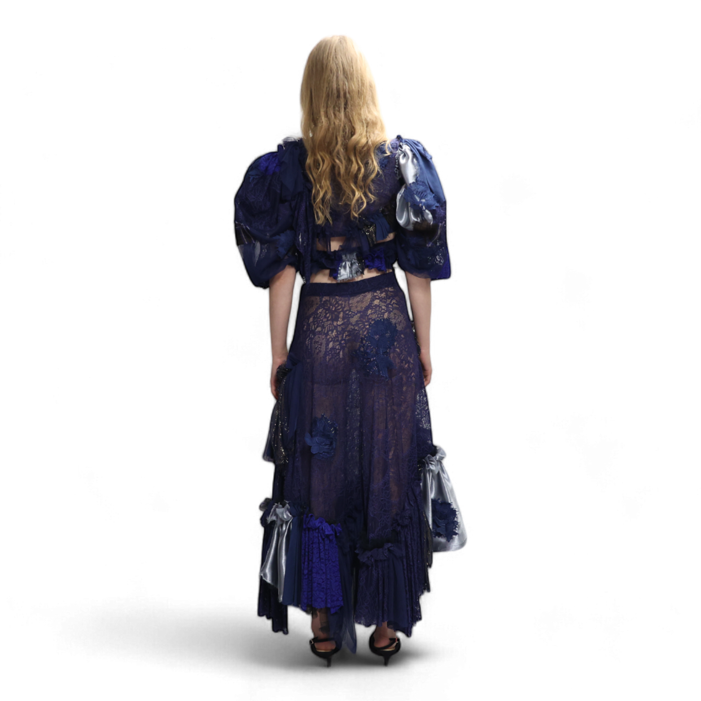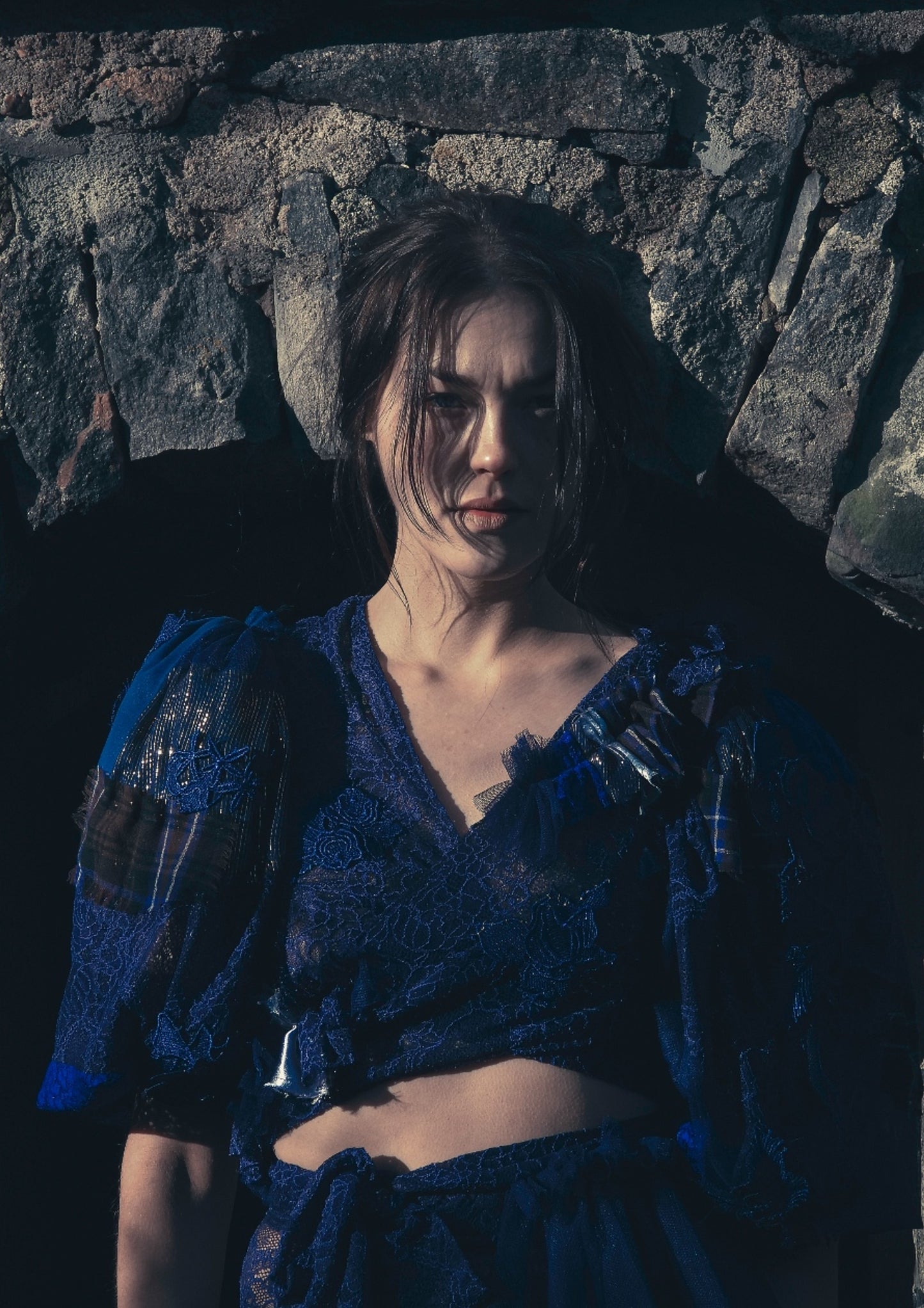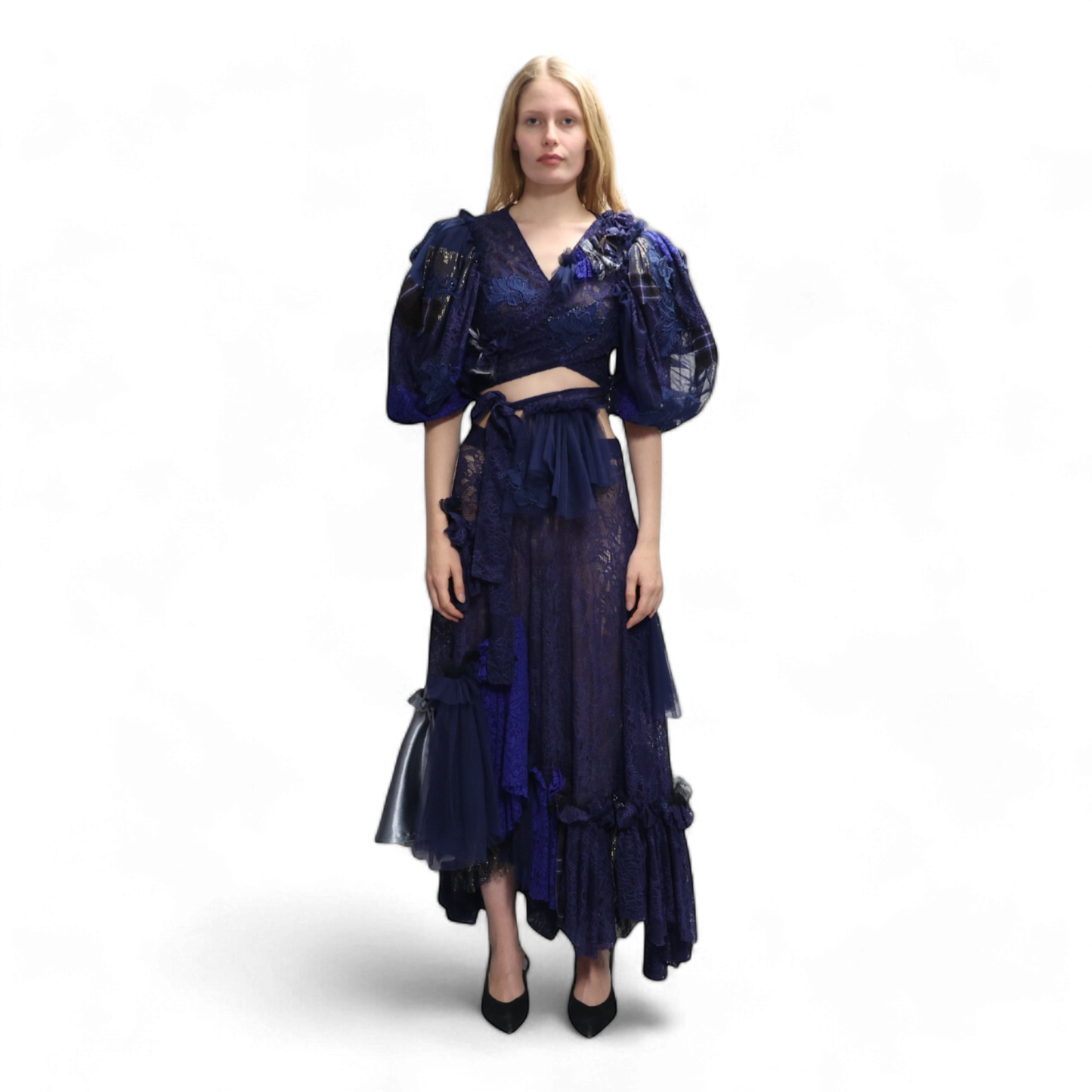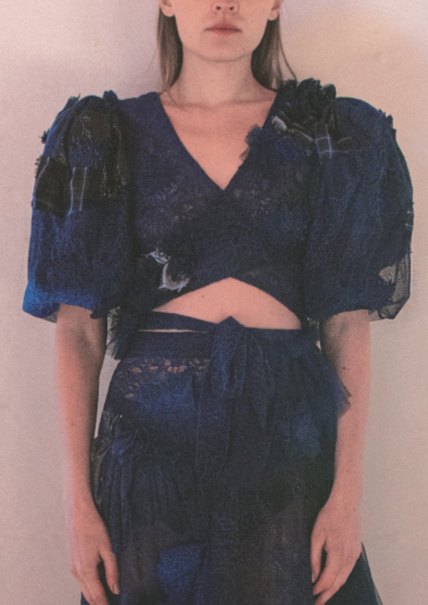 The RUIS Wrap Shirt base fabric is a flower-patterned lace and the base design is a cropped symmetrical wrap shirt with voluminous sleeves. The shirt hem pieces are long so they can be wrapped to the back and back to front. The top decor is made out of different cutting waste and placed asymmetrically.